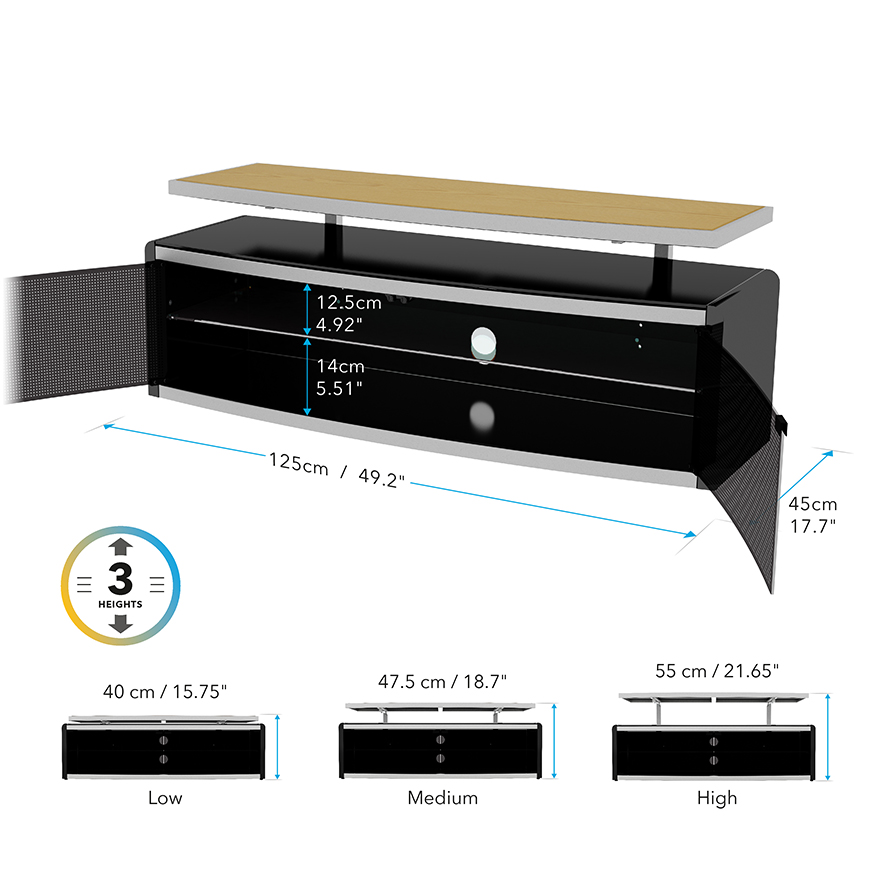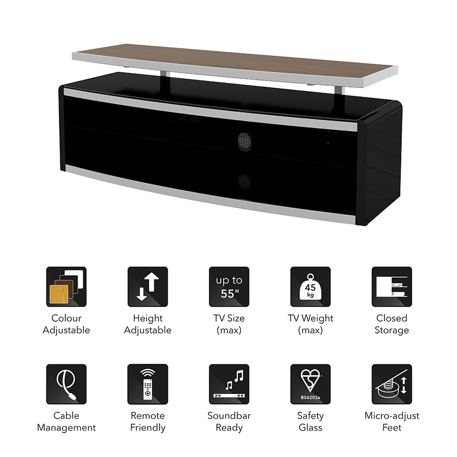 A substantial looking piece of furniture that combines generous closed media storage with remote friendly glass doors plus a colour and height adjustable TV Platform (Oak, Walnut, Black and White surfaces included).