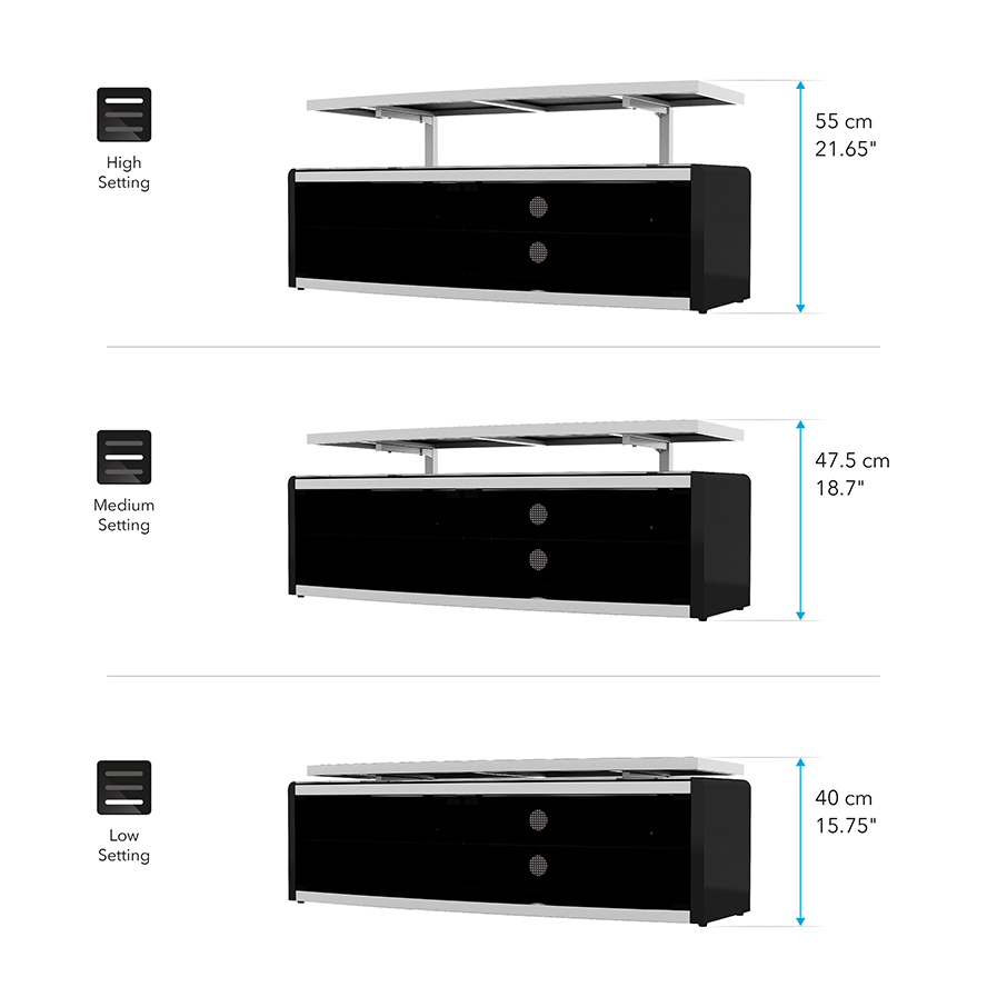Raise or lower the TV platform to achieve your perfect TV viewing height while creating an open space beneath that is ideal for Speakers or a Sound Bar.