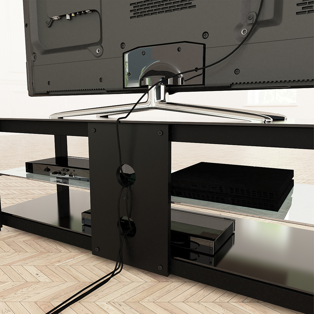 Wiring can be channeled through the cable management apertures and behind the central back panel for a tidy finish, while micro adjustable feet counteract uneven floors.