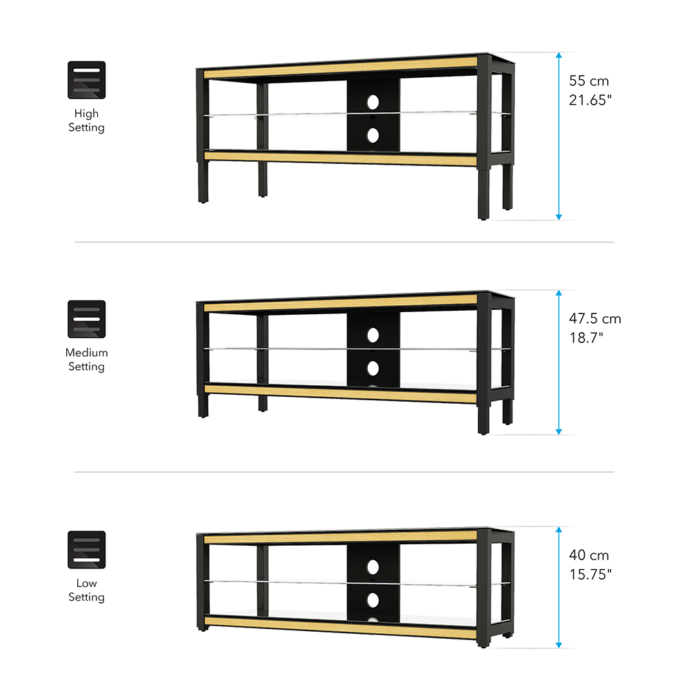 Smaller screens may benefit from a higher position, while larger TVs can be set low to ensure an eye level screen centre for seated viewers.