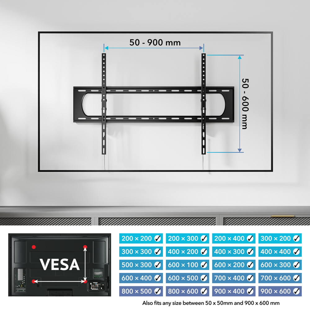 Fits TV VESA sizes from 50 x 50mm up to 900 x 600mm. Includes fixings for wood stud and solid walls.
