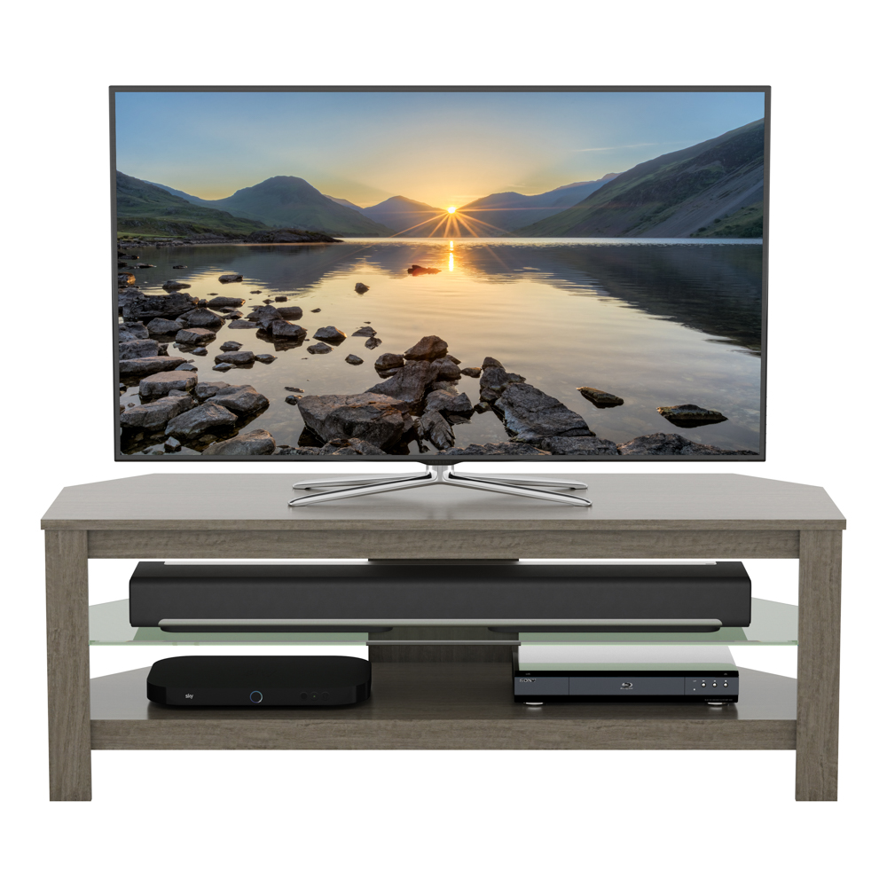 Sturdy construction, finished in a naturally attractive grey wood effect with a toughened glass shelf which provides an elegant way to support your consoles and media players.