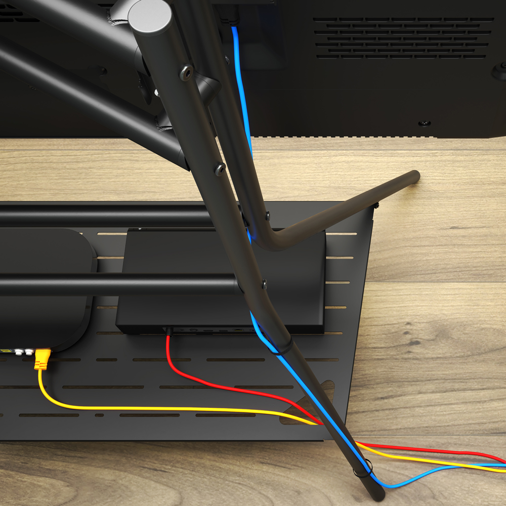 Tiga Quad’s lower shelf supports AV devices up to 10kg and is vented to help keep things running cool. A cable tidy aperture in the shelf and hook & loop cable straps on rear leg reduce cable mess and complete your stylish all-in-one entertainment solution. The foot caps are rounded for smooth, no-damage contact with flooring.