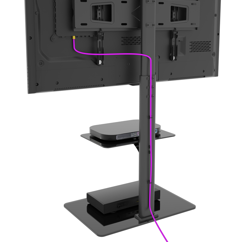 Securely mount your TV at your desired viewing height with easy adjustability. Loft has our biggest height range availability yet, giving you more freedom to tailor your entertainment set-up. 45° screen swivel allows you to turn the screen away from light sources or windows to reduce glare, or simply to improve your view from another part of the room. The floating shelf and base are both made from tempered safety glass and offer room for game consoles, streaming boxes, and more. Cable management clips are built into the back of the column so all your TV and device cables can be tucked neatly out of sight.