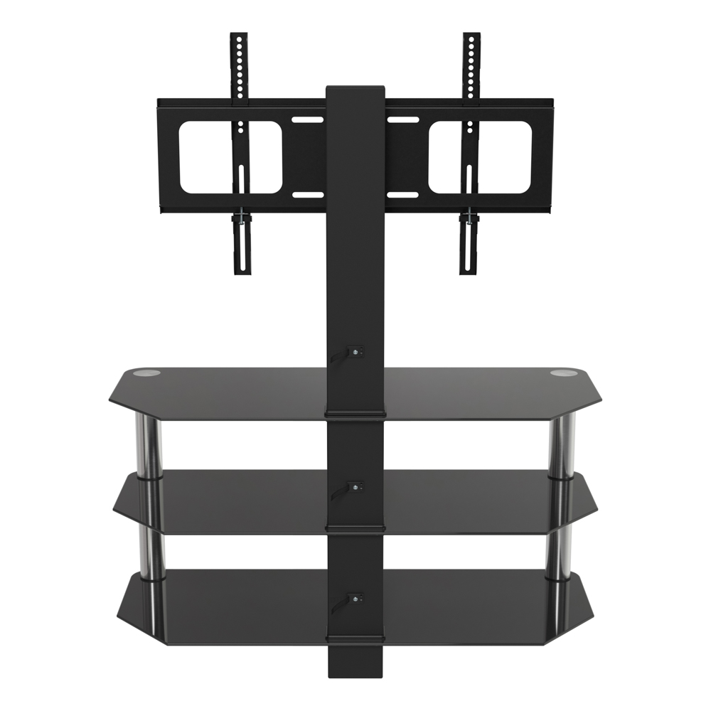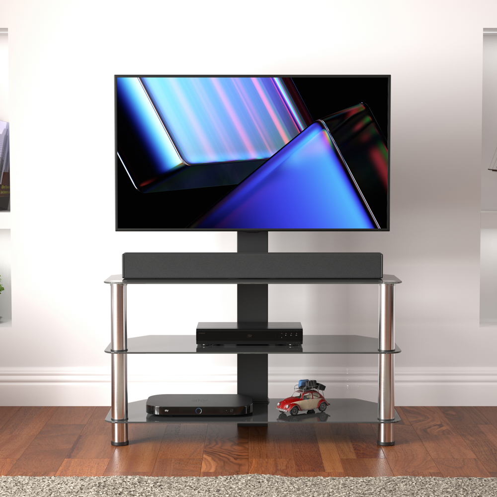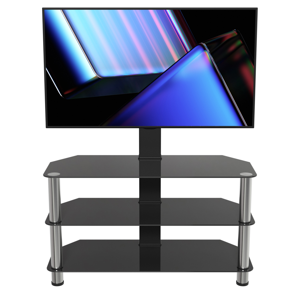 A super easy to construct, contemporary and versatile solution for your home entertainment needs. The black tempered safety glass and durable stainless steel legs modernize any space while the angled corners save valuable space when placed into a corner of your room. Arrange your various AV components on the middle and bottom shelves.