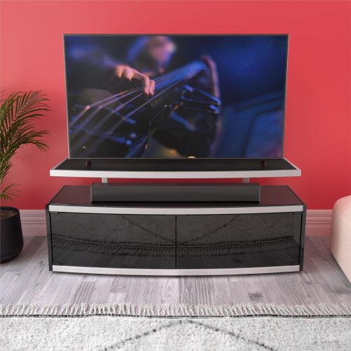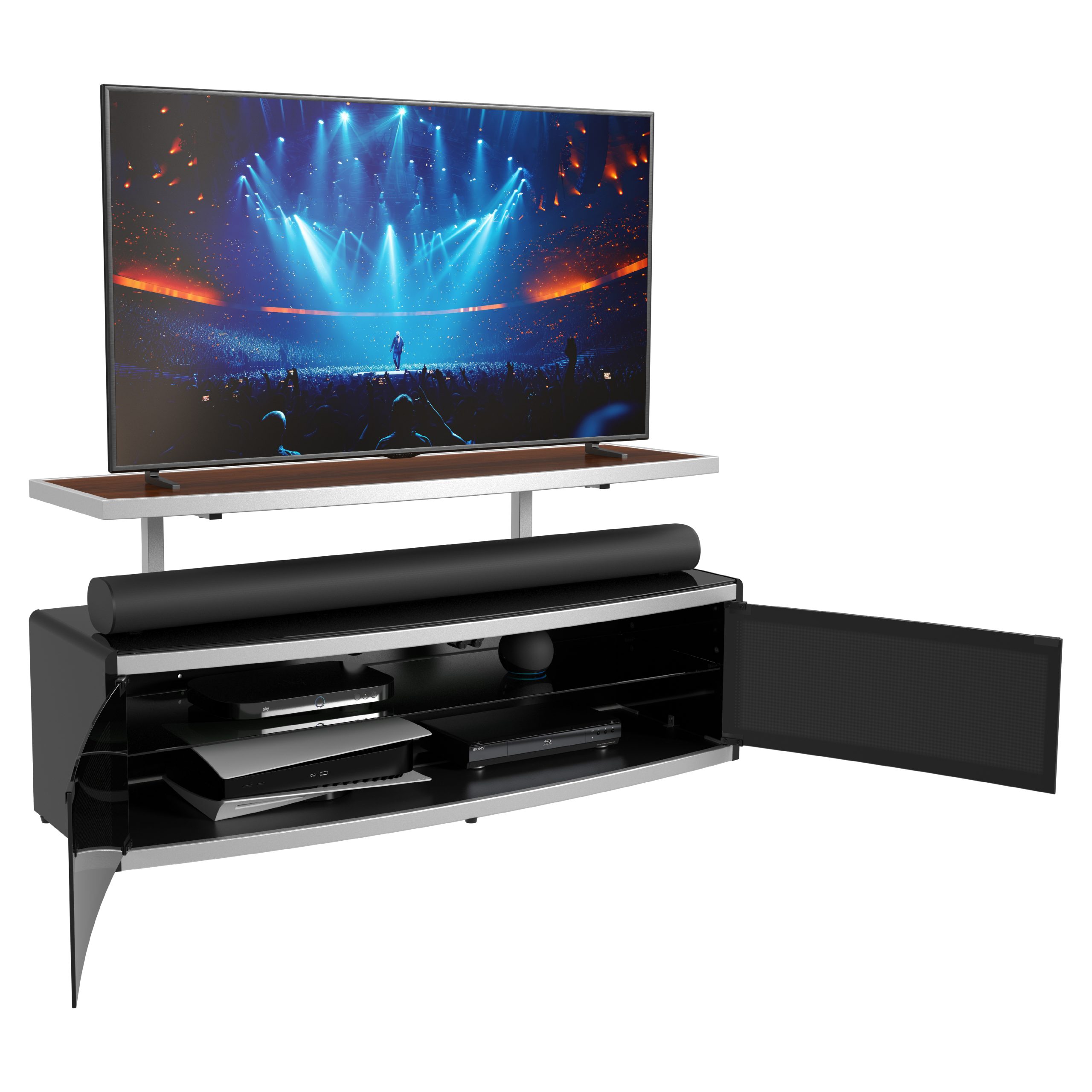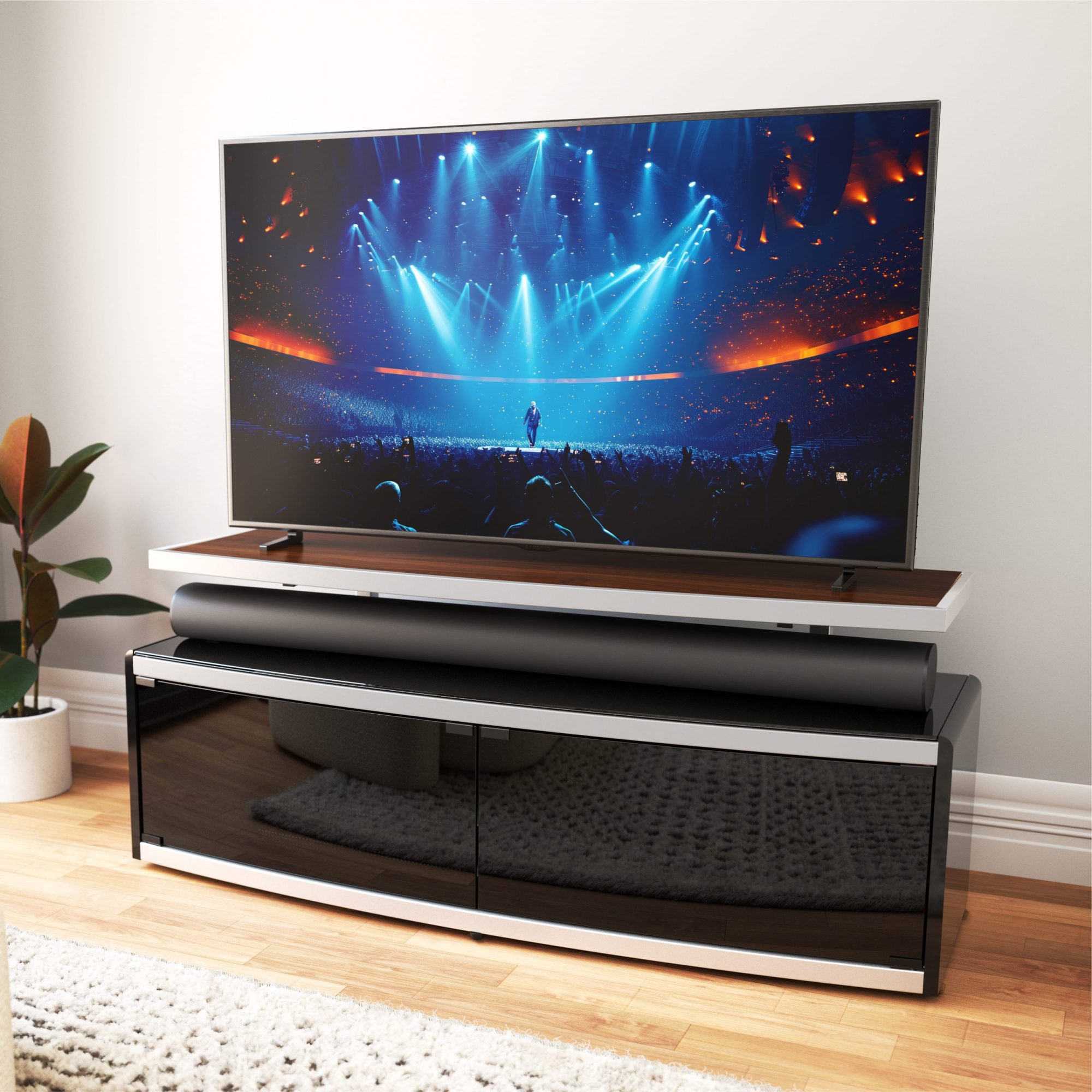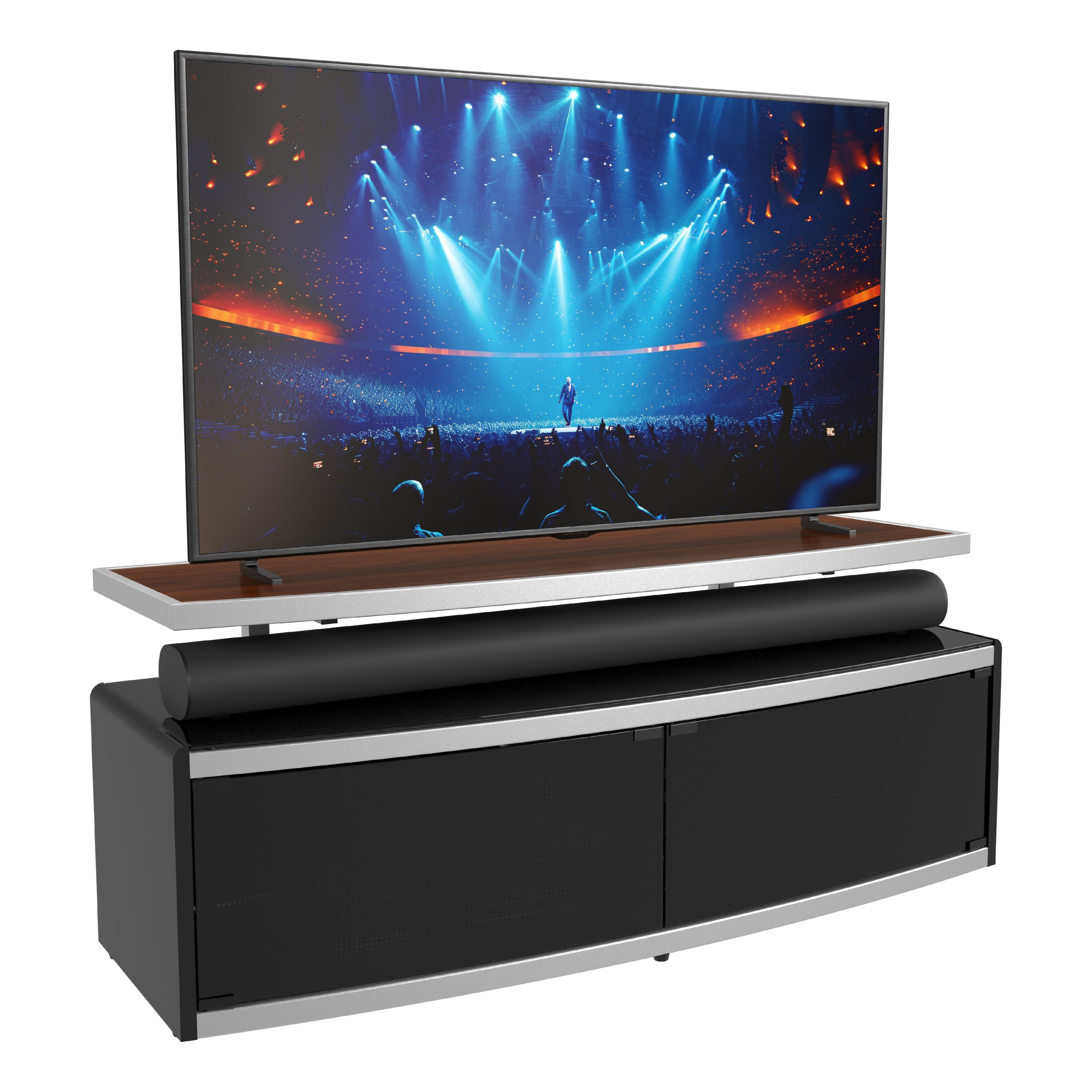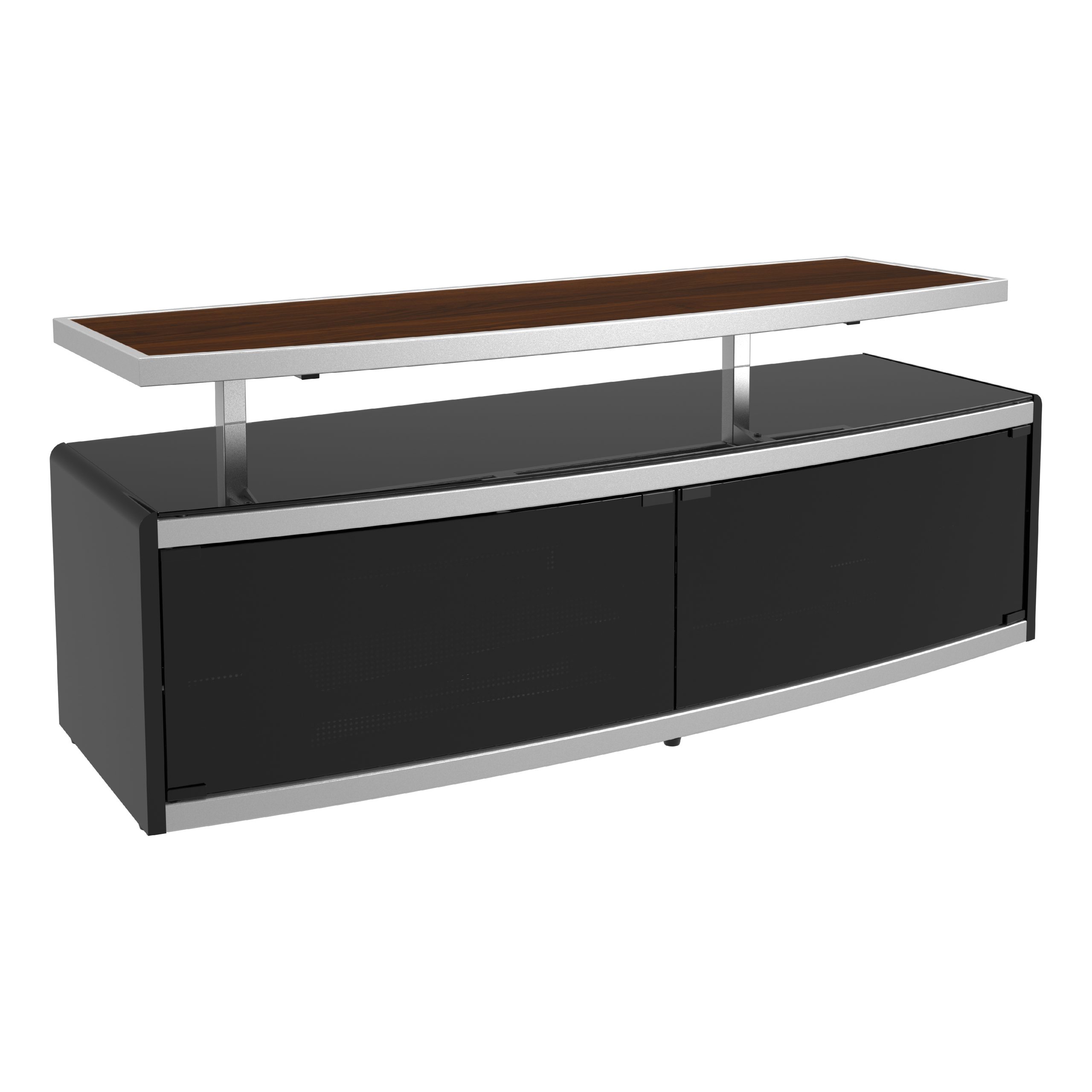 A substantial looking piece of furniture that combines generous closed media storage with remote friendly glass doors plus a colour and height adjustable TV Platform (Walnut & Black).
