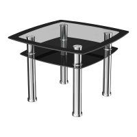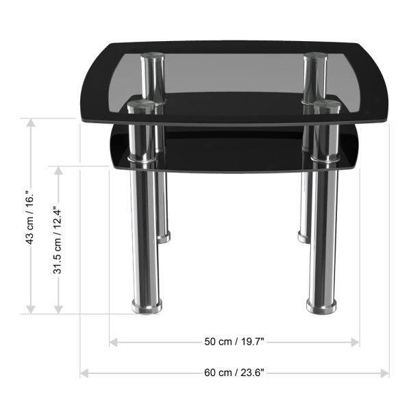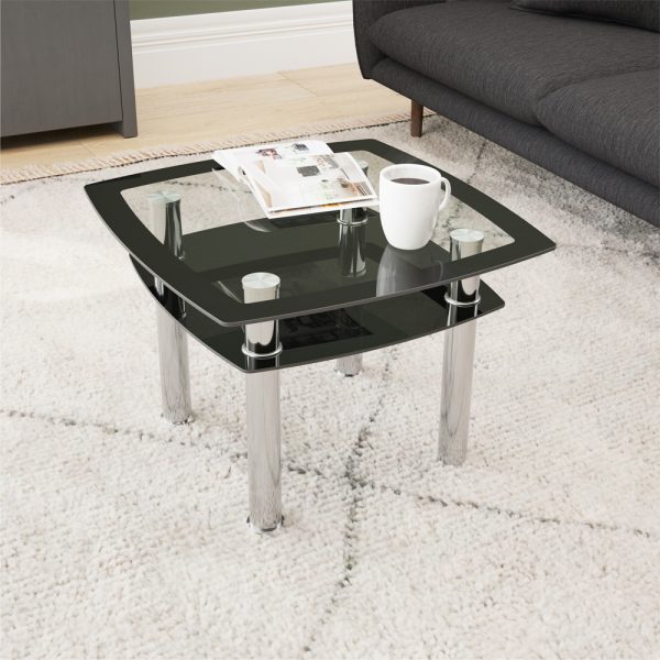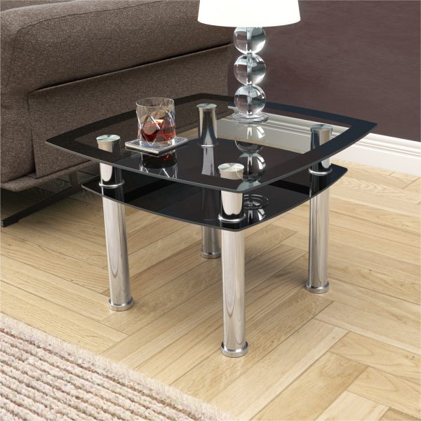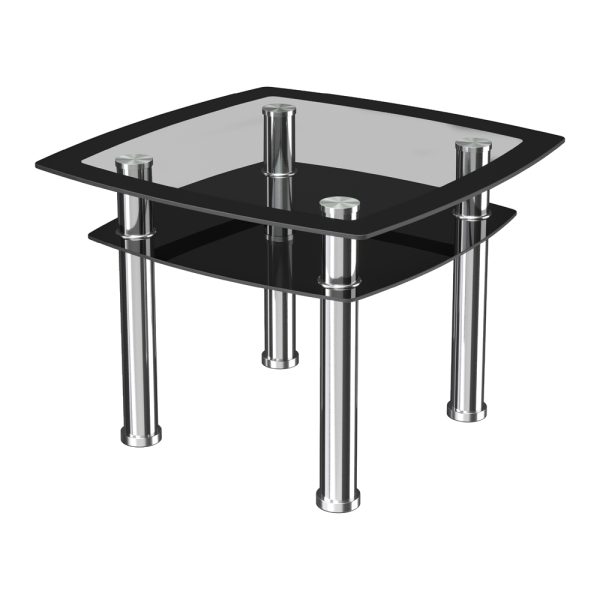 A contemporary Black glass and chrome effect lamp table with clear window looking through to suspended lower shelf. A must have versatile solution for your home needs that is sturdy in design and easy to assemble.