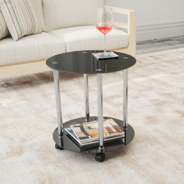 T62: 2-Tier Round Table with Locking Wheels (Black Glass & Chrome)