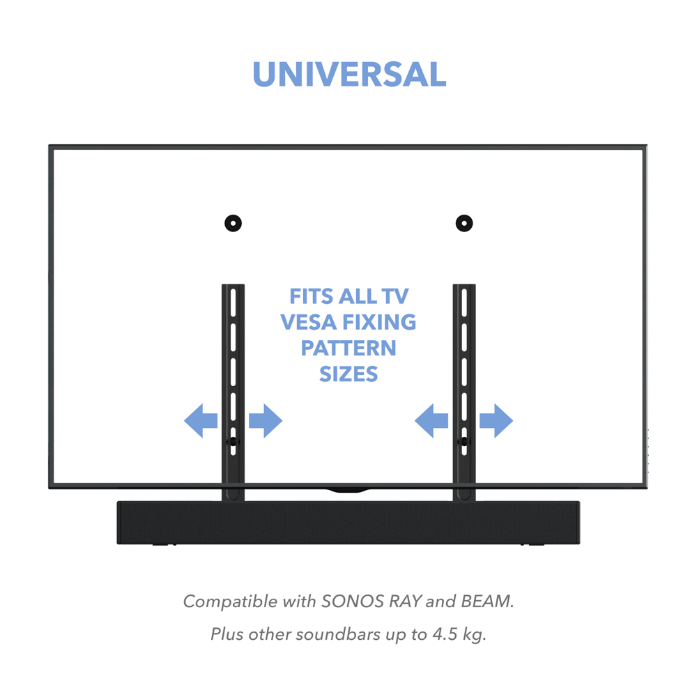 The perfect solution for mounting your Soundbar above or below your TV the AVF Universal soundbar mounting kit mounts to any TV with VESA mounting points and fits any soundbar. Fixing your soundbar to your TV allows the soundbar to move with the screen enhancing your viewing experience.