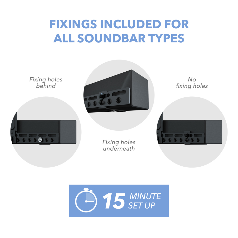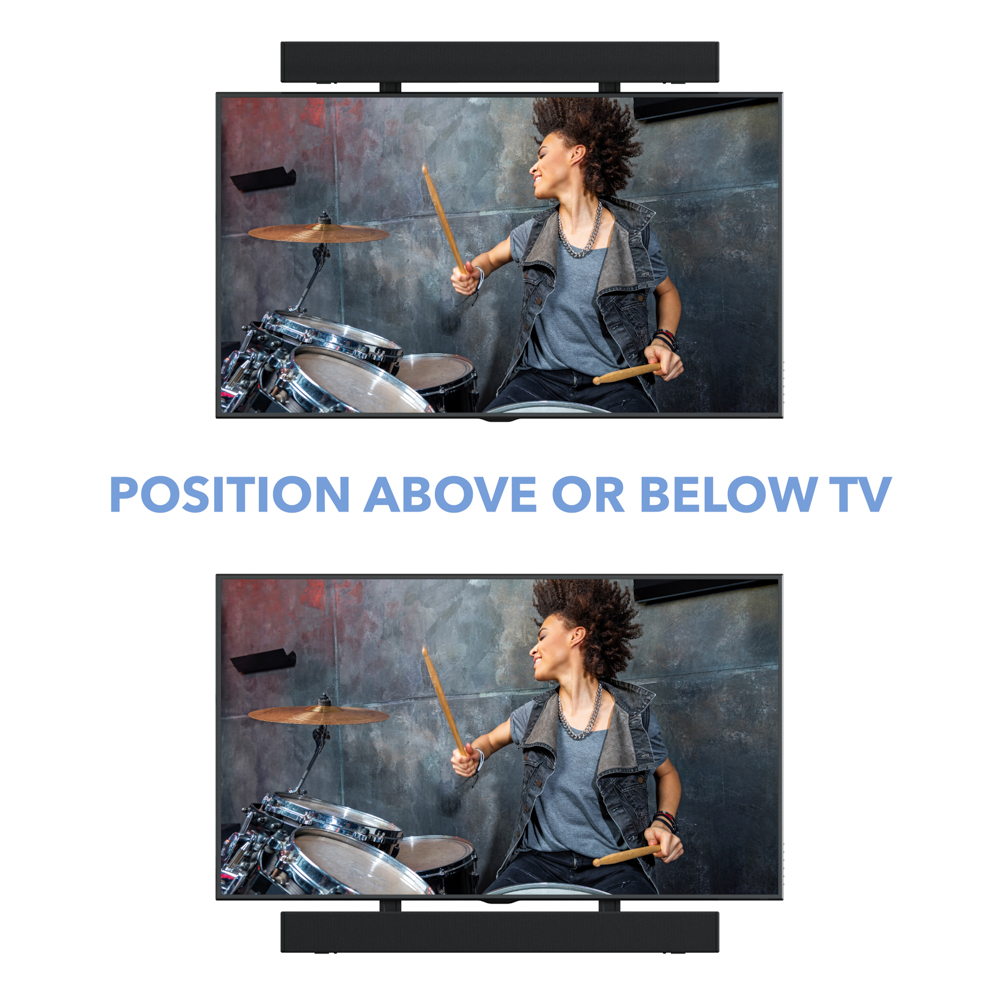 • Fits any soundbar, even if the soundbar doesn’t have mounting holes.